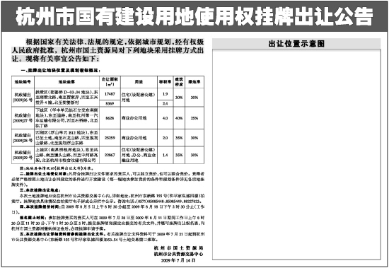 五、本次挂牌出让详细资料请参阅挂牌出让文件。有关挂牌出让文件资料可于2009年7月21日起到杭州市公共资源交易中心(东新路155号和平家私城四楼)B53、54号土地交易窗口索取。