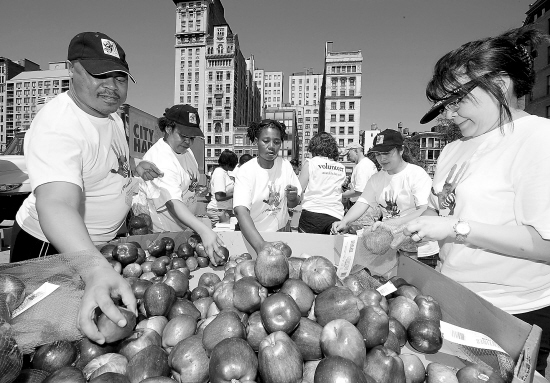 图为7月14日,志愿者在美国纽约为需要帮助的人们分装苹果,以庆祝“曼德拉日”。