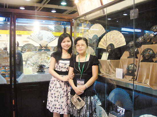 赵平加与女儿游晓婷在扇艺展示橱窗前。