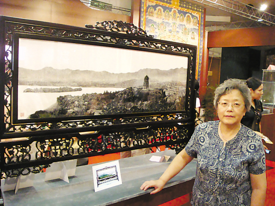 国家级工艺美术大师王文瑛在《西湖今昔》双面绣前。