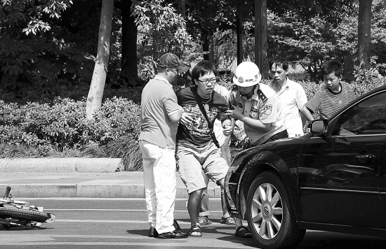7月15日9时许,杭州南山路上一位骑电动车的小伙子不慎跌倒在地,交警和行人很快把他扶起。时下正是高温季节,市民出行要注意安全。 黄曙林 摄