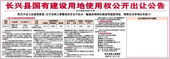 六、符合拍卖条件的宗地,其国有建设用地使用权拍卖会定于2009年8月7日15时30分在长兴县招投标中心举办。