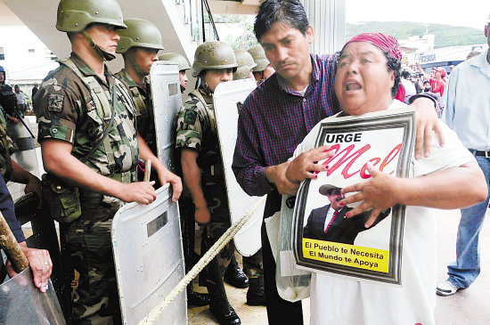 | 图为7月15日,洪都拉斯被罢免总统塞拉亚的支持者在首都特古西加尔巴的洪都拉斯议会附近参加示威游行,要求临时总统辞职。 新华社发 |