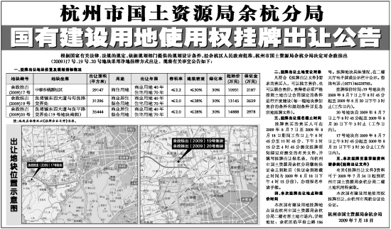 根据国家有关法律、法规的规定,依据规划部门提供的规划设计条件,经余杭区人民政府批准,杭州市国土资源局余杭分局决定对余政挂出(2009)17号、19号、20号地块采用净地挂牌方式出让。现将有关事宜公告如下: