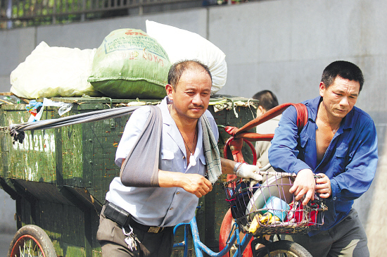 日前,在杭州望江立交桥下坡度很陡的大转盘上,紫阳环卫所聘请的两位外来农民工,正吃力地拉着垃圾车上坡。据了解,他们每天要拉20多车垃圾上坡,工作十分辛苦。 吴元峰 摄