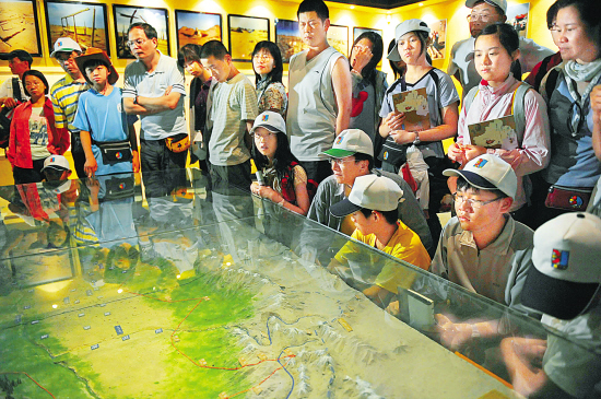 | 为乌鲁木齐“7·5事件”后人数最多的一个旅行团 7月21日,“丝绸之路旅行团”一行125名台湾游客,来到乌鲁木齐市新疆博物馆参观。这是乌鲁木齐“7·5事件”发生后来疆人数最多的一个旅行团。新疆维吾尔自治区主席努尔·白克力18日表示,“7·5事件”后遭受重创的新疆旅游业已出现复苏迹象,赴疆游客数量开始回升。新华社发 |