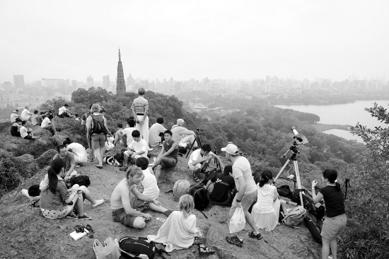 在宝石山上,人们从凌晨开始守在这里,占领有利地形,等待早上的日食。黄曙林 钟昊摄