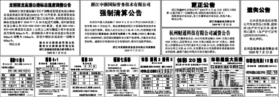 杭州市中级人民法院于2009年6月10日作出(2008)杭民二初字第265-1号决定书,指定清算组对浙江中浙国际劳务技术有限公司进行清算。债权人应自公告之日起45日内,向清算组书面申报其债权(联系地址:杭州市马塍路3号,邮编:310012,费小姐:0571-88809500),说明债权数额和有无财产担保等,并提交有关证明材料。逾期未申报或未补充申报债权的,视为自动放弃债权。