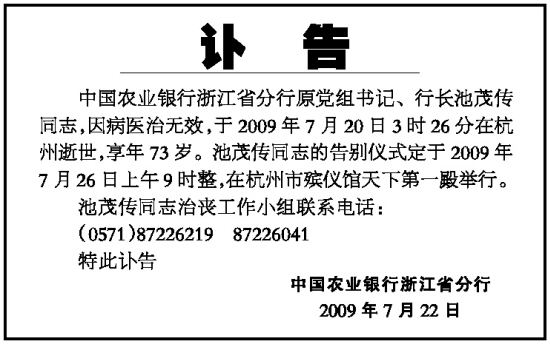 中国农业银行浙江省分行原党组书记、行长池茂传同志,因病医治无效,于2009年7月20日3时26分在杭州逝世,享年73岁。池茂传同志的告别仪式定于2009年7月26日上午9时整,在杭州市殡仪馆天下第一殿举行。