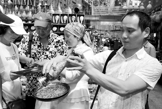 图为一位游客(右)在国际大巴扎一家铜器店挑选商品。