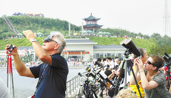 数千名来自世界各地的科学家和天文爱好者,聚集安吉天荒坪山顶的江南天池,共赏日全食美妙天文景象。 本报记者 徐斌 摄