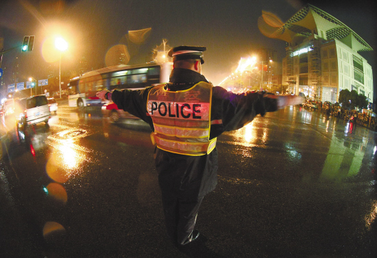 →上海市白昼如夜,交警在人民大道西藏中路路口指挥交通。