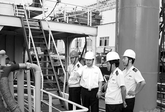 近日,临海市国税局组织干部深入船舶制造企业了解税收优惠政策落实情况。图为该局干部在方圆船厂进行政策辅导。