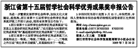 1.浙江省第十五届哲学社会科学优秀成果奖设“马克思主义理论研究优秀成果奖”、“应用理论与对策研究优秀成果奖”和“基础理论研究优秀成果奖”三大类别。