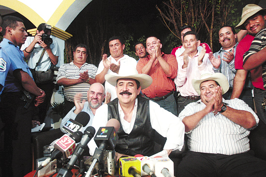 | 抵达洪尼边境附近 7月23日,在距离洪都拉斯边境40公里的尼加拉瓜北部城市埃斯特利,洪都拉斯被罢免总统塞拉亚(前中)举行新闻发布会。塞拉亚当日下午从尼加拉瓜首都马那瓜出发,亲自驾车前往洪都拉斯,目前已抵达埃斯特利。 新华社发 |