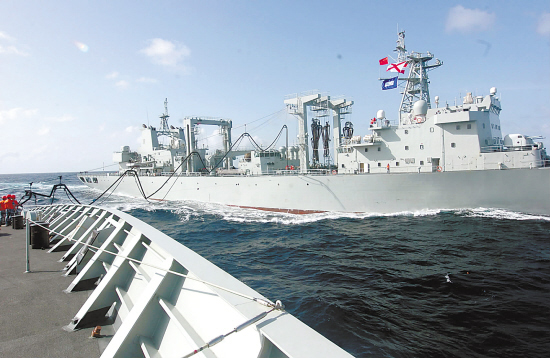 | 7月25日,在斯里兰卡西南公海海域,“千岛湖”号综合补给舰(后)向“舟山”号导弹护卫舰进行航行中的横向补给。当日上午,中国海军第三批护航编队进行了起航以来的第二次海上补给。与20日进行的“三舰合一”海上停泊靠帮补给不同的是,本次补给采取了操作难度更大的航行中横向补给方式,补给过程中舰艇间距始终保持在42米左右,属于优秀的补给水平。 新华社发 |