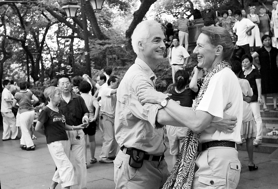 7月22日一大早,一批在杭州吴山景区游玩的德国游客,看见许多早锻炼的杭城市民翩翩起舞,也情不自禁舞起来。