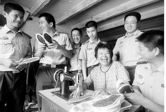| 7月26日上午,台州市路桥区金清镇剑门港村68岁的拥军大妈吴荷香,为一群“兵儿子”做鞋垫。曾多次获得“拥军模范”的吴大妈,一直把驻地黄琅边防官兵视如亲儿子,经常上门为他们清洗衣被,深受官兵们的爱戴。 王保初 潘中华 徐雨薇 摄 |