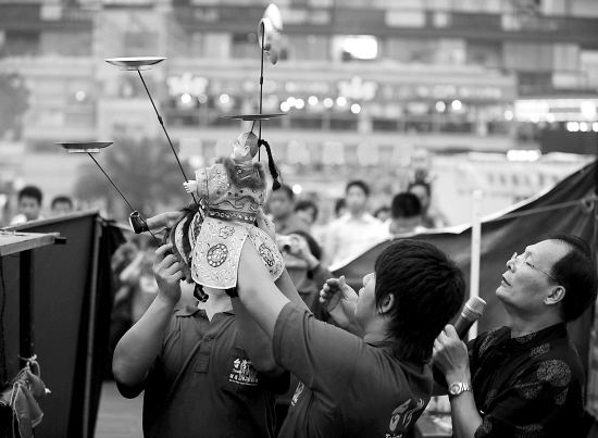 7月25日晚,台湾诸罗山木偶剧团在宁波天一广场表演传统台湾布袋戏。布袋戏是把傀儡托在掌上表演,又叫掌中戏,这个戏种和提线木偶一样,濒临失传。