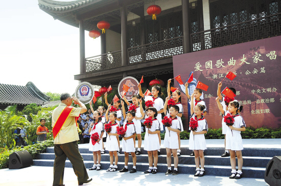 图为嘉兴公安民警的子女演唱《让我们荡起双桨》,并和公安部一级英模李本春相互致敬。