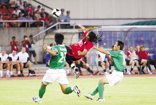 7月26日,曼联队员与绿城队员在比赛中拼抢,最终曼联以8比2 战胜绿城队。本报记者 钟昊 摄