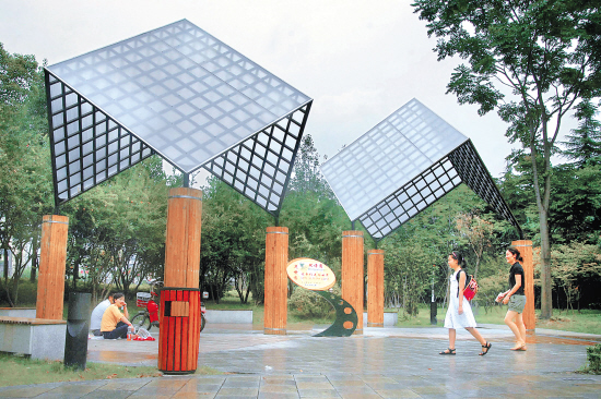 图为7月27日在上海市广中路拍摄的新型休闲凉亭。这组凉亭的顶部由太阳能电池板制成,能为凉亭及周围绿地的照明设施提供电能。新华社发
