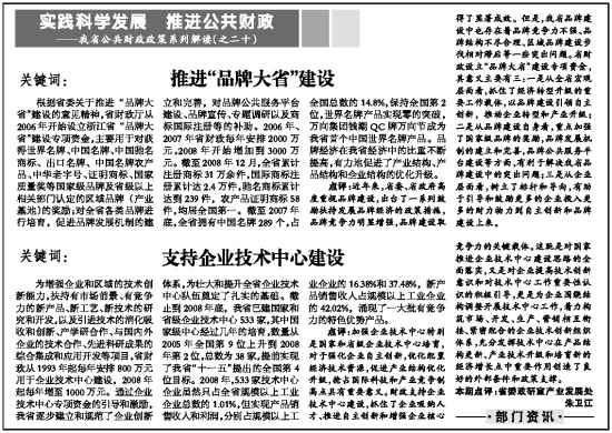 根据省委关于推进“品牌大省”建设的意见精神,省财政厅从2006年开始设立浙江省“品牌大省”建设专项资金,主要用于对获得世界名牌、中国名牌、中国驰名商标、出口名牌、中国名牌农产品、中华老字号、证明商标、国家质量奖等国家级品牌及省级以上相关部门认定的区域品牌(产业基地)的奖励;对全省各类品牌进行培育,促进品牌发展机制的建立和完善,对品牌公共服务平台建设、品牌宣传、专题调研以及商标国际注册等的补助。2006年、2007年省财政每年安排2000万元,2008年开始增加到3000万元。截至2008年12月,全省累计注册商标31万余件,国际商标注册累计达2.4万件,驰名商标累计达到239件,农产品证明商标58件,均居全国第一。截至2007年底,全省拥有中国名牌289个,占全国总数的14.8%,保持全国第2位,世界名牌产品实现零的突破,万向集团钱潮QC牌万向节成为我省首个中国世界名牌产品。品牌经济在我省经济中的比重不断提高,有力地促进了产业结构、产品结构和企业结构的优化升级。