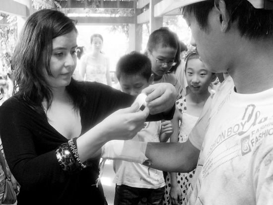 | 外援教师娜娜(左一)为农民工包扎“伤口”。日前,杭州医护人员来到古荡街道莲花社区,和民工、小学生开展急救演练活动。 本报记者 邵全海 通讯员 陈燕斐 戚晓晴 摄 |