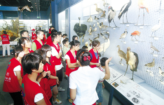 | 7月28日,在浙江省自然博物馆内,一群身穿红马甲的特殊观众正在认真地听讲解做笔记,今后,他们将成为这里的义务讲解员。当天,浙江省规模最大的综合性文化设施——西湖文化广场全面建成,位于A区的浙江省科技馆新馆和B区的浙江自然博物馆新馆率先开馆。 本报记者 钟昊 通讯员 李挺 摄 |