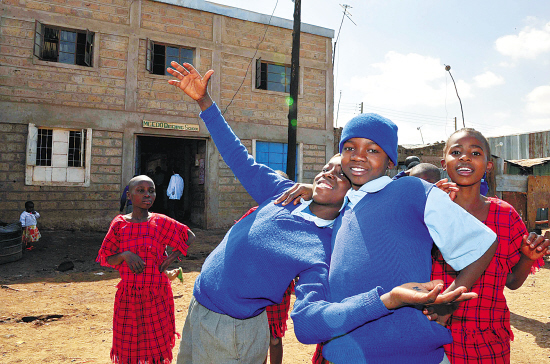 | 姆赛多-北京小学位于肯尼亚首都内罗毕马萨莱贫民窟内,该小学始建于2001年,原名“姆赛多小学”,有190多名学生,其中三分之一是孤儿,还有三分之一来自单亲家庭。过去,其校舍都是租借贫民窟中的破旧土屋,教学环境很差。驻内罗毕联合国机构的志愿者2006年发起一项募捐行动,为该校修建校舍筹集资金,中国驻肯使馆因此提供了2.5万美元捐款。为表达对中国的感谢,校方在新校舍于2007年6月落成后将校名改为“姆赛多-北京小学”。图为7月28日,姆赛多-北京小学的孩子们在校舍前玩耍。 新华社发 |
