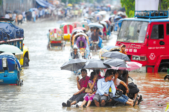7月28日,在孟加拉国首都达卡,一些居民撑伞坐在人力车上通过被淹没的街道。据当地气象机构记录,达卡28日凌晨至早上7时的降水量达333毫米。 新华社发