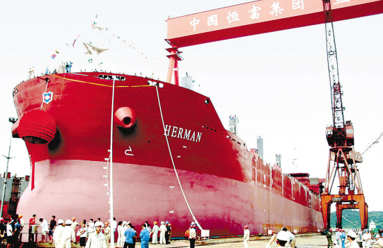 | 29日,宁波恒富集团蓝天造船有限公司建造的第一艘57000吨巴拿马型散装货船——HB2007成功下水。该船总长190米,型宽32.26米,型深11.4米。这是宁波承建单船吨位最大的船舶。 北仑报道组 陈未鸣 李孟龙 记者 陈醉 摄 |