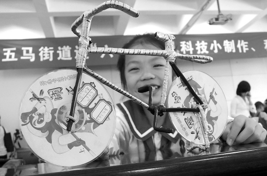 | 温州市区建设小学的杨更青同学正在展示刚刚完工的一辆小自行车。这个小手工艺品,是她用了两个废光盘、几根铁丝再加胶带纸制作而成的。在五马街道主办的辖区少儿科技小制作、科幻画比赛上,6所小学的60多名学生参加了以“环保·创新·未来”为主题的现场比赛。郑鹏 摄 |