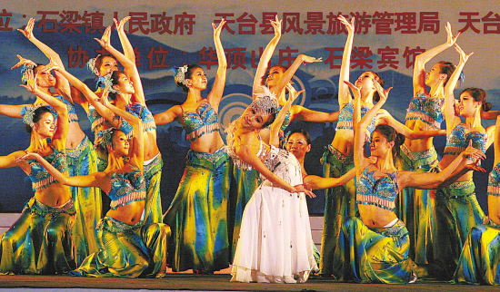 | 晚风习习、灯火璀璨、歌声飞扬,首届天台山石梁避暑节7月30日晚在地处海拔800米的石梁镇开幕,2000多名中外观众在高山上欣赏了展现天台山文化的精彩晚会。在天台山文化展演晚会举办的同时,中外天台山文化交流活动、天台山音乐节、石梁风情DV摄影大赛等也相继启动。图为晚会上的歌舞表演。 记者 洪卫 俞益成 天台县报道组 丁必裕 摄 |