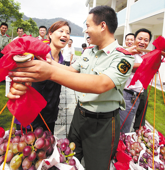 昨天,宁波镇海区九龙湖镇杜夹岙村的果农代表把刚采摘的葡萄送给驻地武警。胡建华 张寒 姚春峰 摄