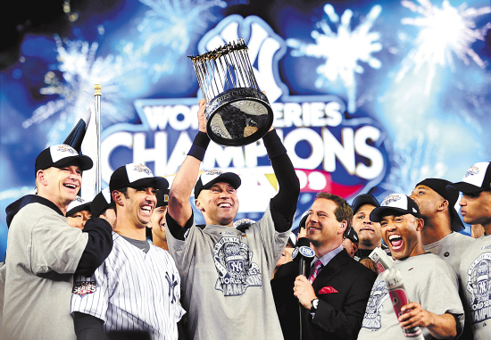 | 11月4日,扬基队球员在领奖台上庆祝夺冠。当日,纽约扬基队主场以7比3战胜卫冕冠军费城人队,从而以4比2的总比分历史上第27次夺得美国职业棒球大联盟总冠军。 新华社 发 |