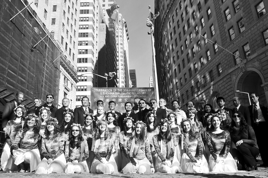 图为11月16日,在美国纽约华尔街,学生乐队成员和出席升旗仪式的各界人士合影。
