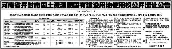 经开封市人民政府批准,开封市国土资源局决定以公开方式出让2009-34号、35号、36号、37号、38号宗地国有建设用地使用权。现将有关事项公告如下: