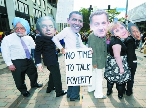 2009年9月25日下午,在二十国集团领导人第三次金融峰会召开期间,美国匹兹堡市中心发生大规模抗议示威活动。这是示威游行者头戴美国、英国、法国、德国、日本和印度国家首脑的头像面具。