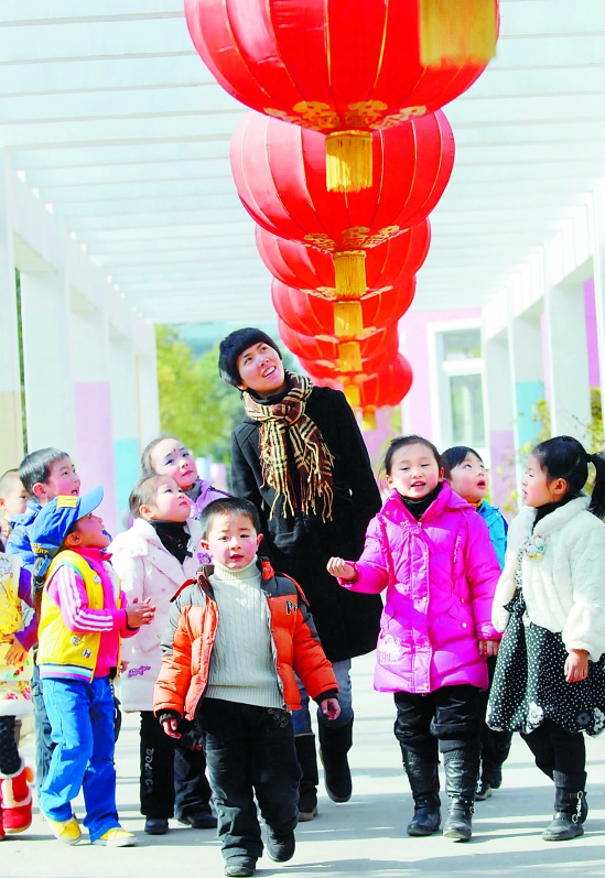 元旦,上虞鹤琴幼儿园小朋友在教师带领下观赏大红灯笼,憧憬美好未来。上虞日报记者 韩坚 摄