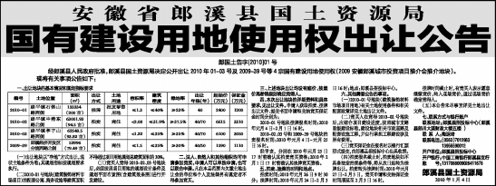 经郎溪县人民政府批准,郎溪县国土资源局决定公开出让2010年01-03号及2009-39号等4宗国有建设用地使用权(2009安徽郎溪城市投资项目推介会推介地块)。现将有关事项公告如下: