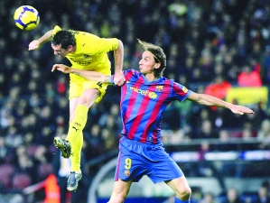 1月2日,巴塞罗那队球员伊布拉希莫维奇(右)与比利亚雷亚尔队球员戈丁争顶。当日,在西甲联赛第16轮比赛中,巴塞罗那队主场以1比1战平比利亚雷亚尔队。 新华社发