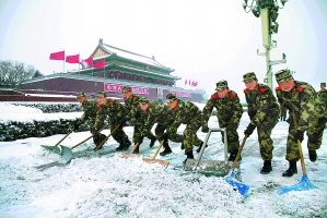 从3日凌晨开始,华北等地普降大雪,强冷空气南扑长江,中东部地区和南方部分地区也将迎来大风降温天气。1月3日,武警战士在北京天安门城楼前清理积雪。 新华社发