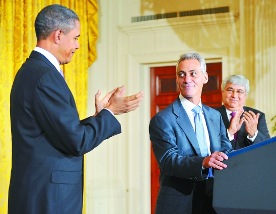 在美国首都华盛顿白宫东厅,美国总统奥巴马(左)为离任的白宫办公厅主任拉姆·伊曼纽尔(中)鼓掌,右为暂时接任的高级助理彼得·劳斯。 新华社发