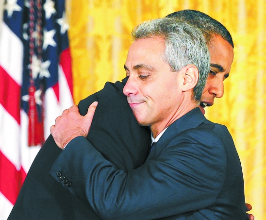 拉姆·伊曼纽尔在白宫参加离职仪式时与美国总统奥巴马拥抱。 新华社发