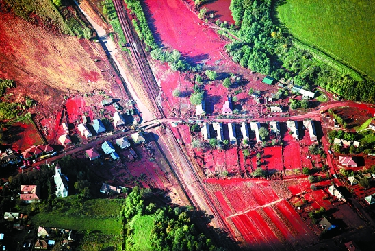 房屋周围的地面被有毒的红色废水染红。 新华社发