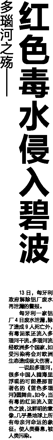 匈牙利一家铝厂4日废水泄漏,除了造成9人死亡外,有毒泥浆还流入多瑙河干流。多瑙河流经欧洲多个国家,如受污染将会对欧洲生态造成极大伤害。
