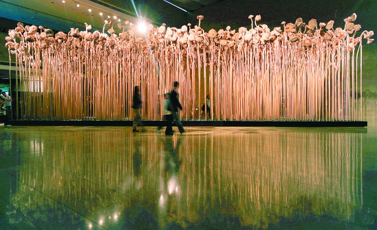 巨型莲蓬和葵花组成的《共生会否可能》。记者 梁臻 李震宇 摄