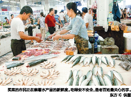 买菜的市民正在察看水产品的新鲜度。吃得安不安全,是老百姓最关心的事。