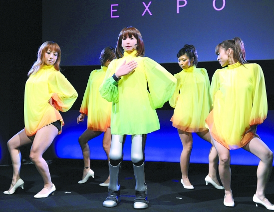 10月17日,日本产业技术综合研究所研制的1.58米高的类人机器人“HRP-4C”(中)在东京一个数字技术博览会上与真人一起唱歌跳舞。 新华社发